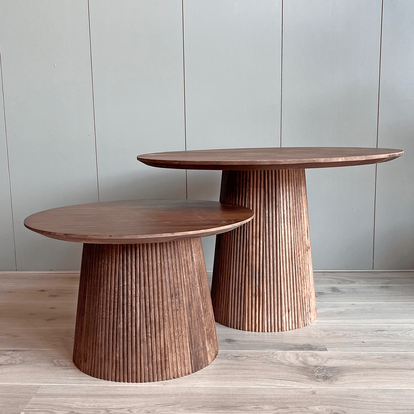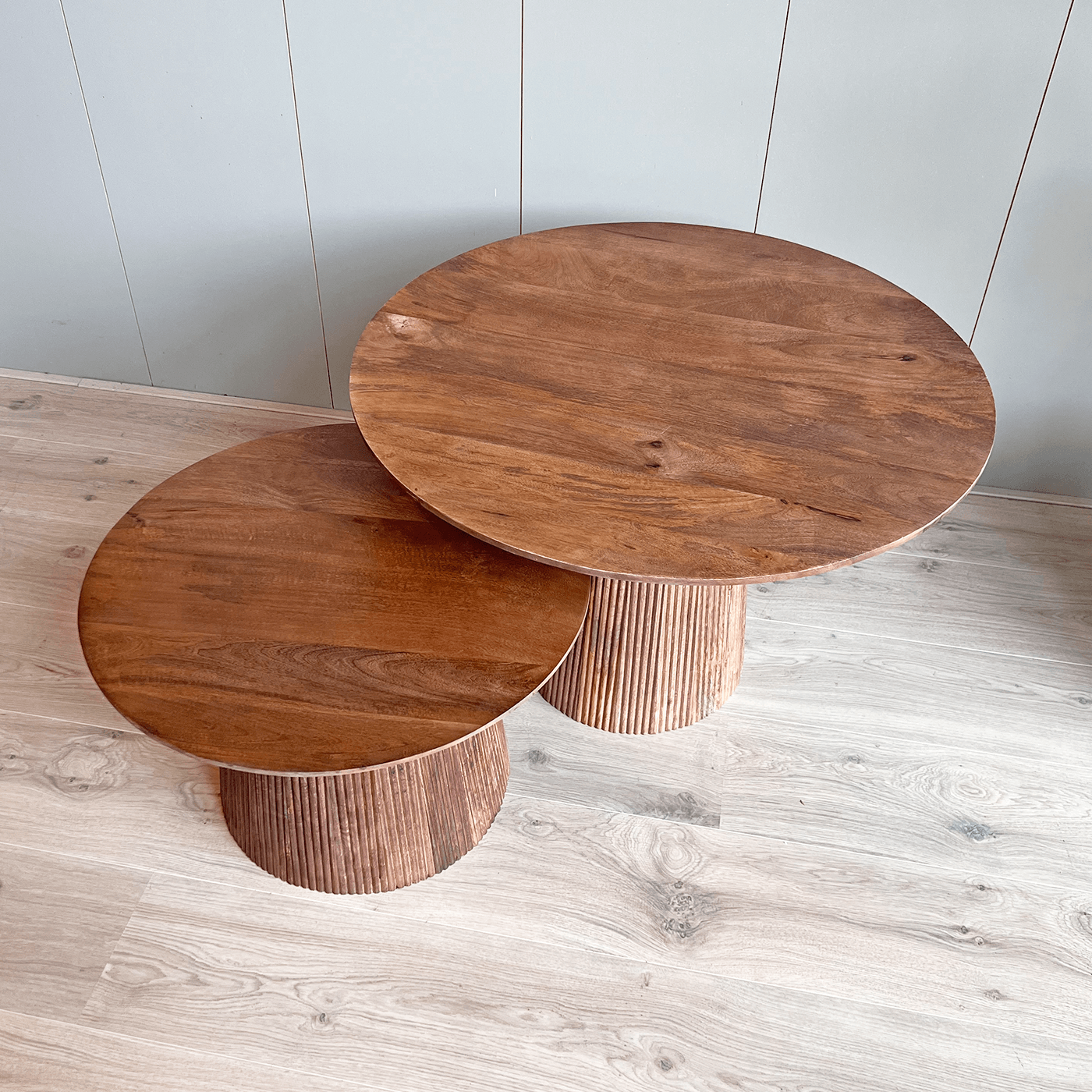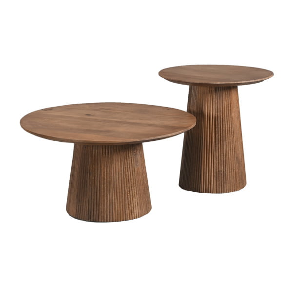 Runder Couchtisch 2er-Set Hotel Chic mit Tischplatte aus massivem Mangoholz mit runden Holzbeinen und einem Durchmesser von 60 cm und 80 cm