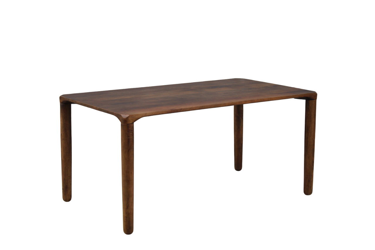 Nancy Esstisch aus Mangoholz, lackiert in einer warmen Walnussfarbe. Zeitloses Design mit abgerundeten Ecken und schlanken Beinen. Geeignet für 4-6 Personen.