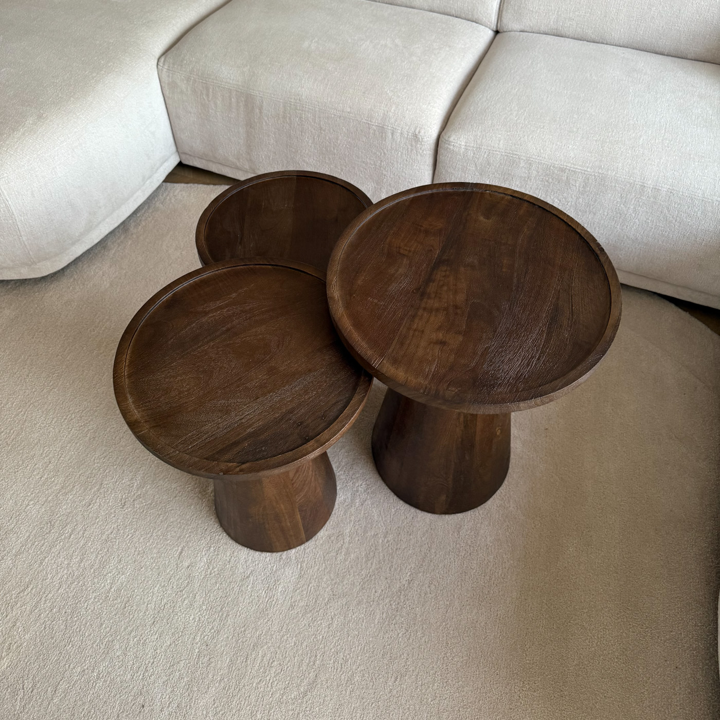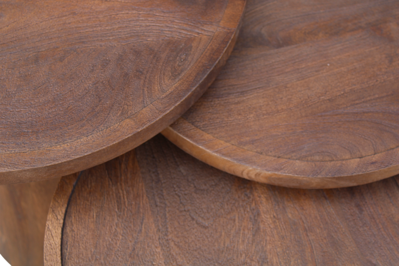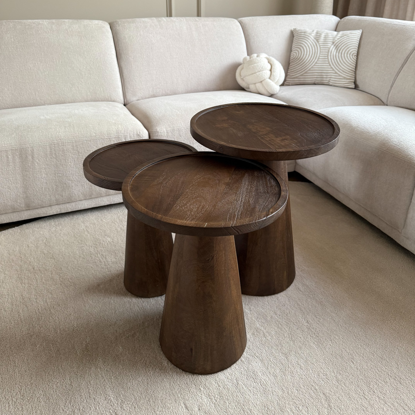 3er-Set Couchtische Oslo aus warmem braunem Mangoholz. Elegantes und vielseitiges Design mit spitz zulaufenden Beinen.