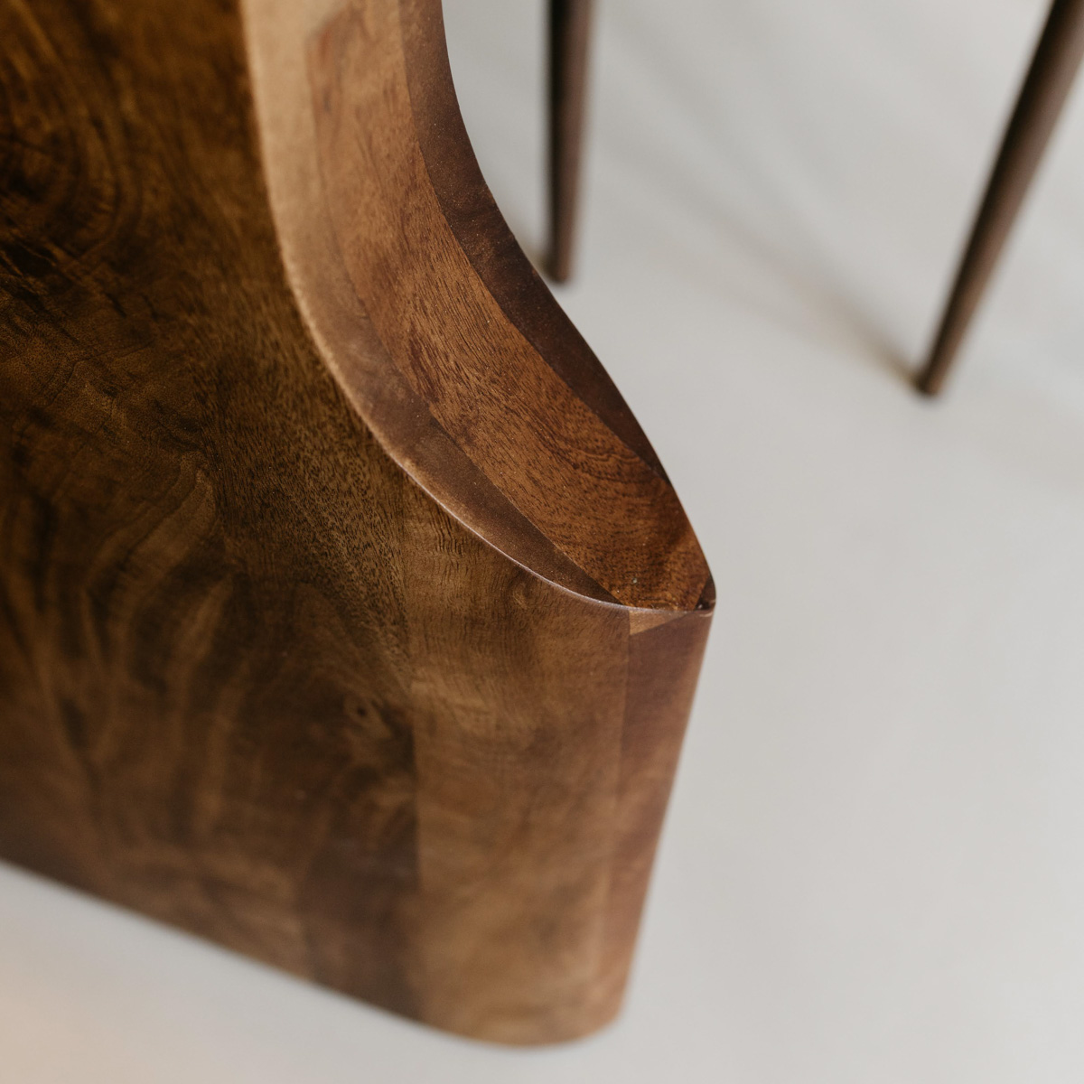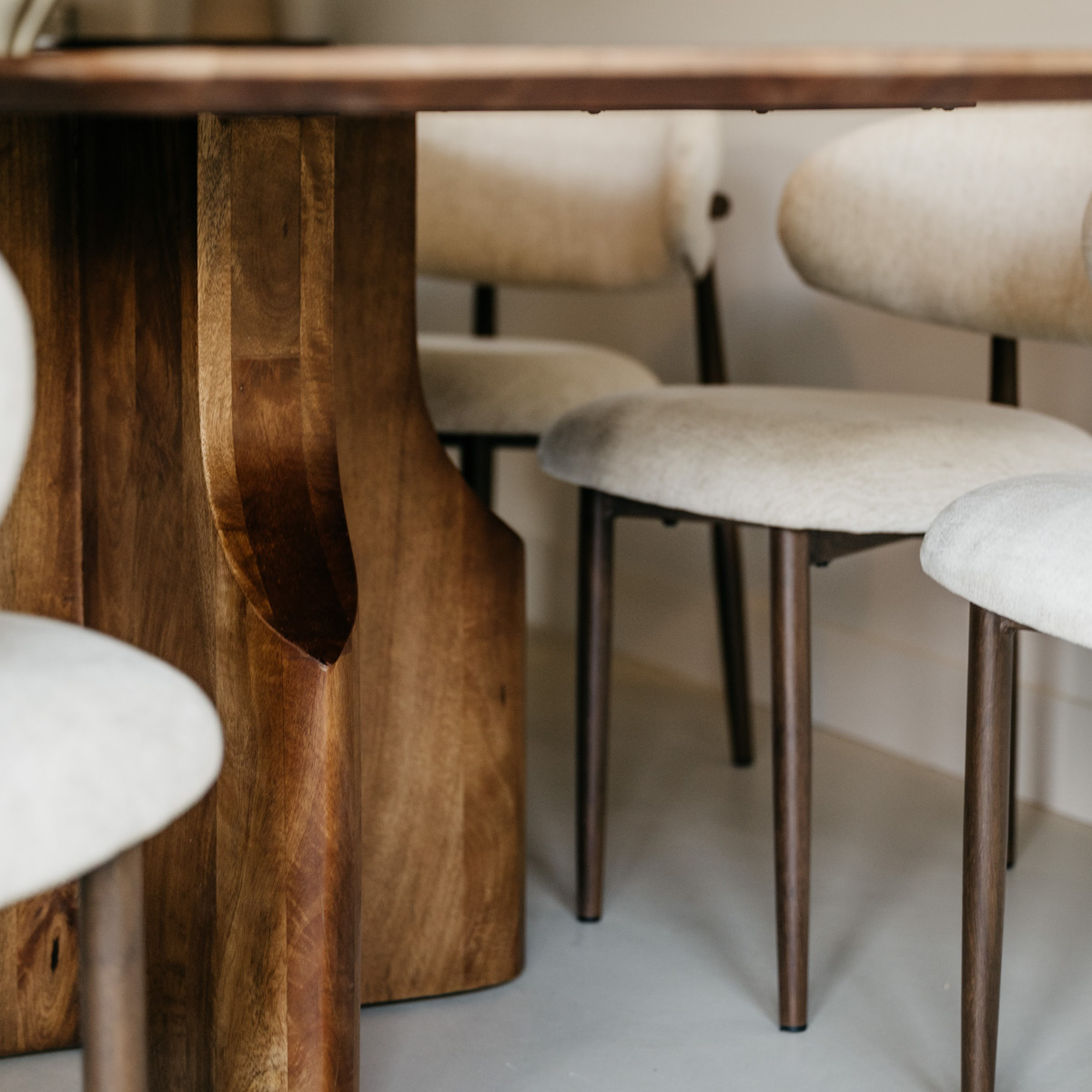 Le piètement est la pièce maîtresse de la table : un pied sculptural en bois dont les formes fluides et artistiques rappellent la sculpture moderne. Ce pied confère à la table sa stabilité tout en attirant le regard dans l’intérieur.