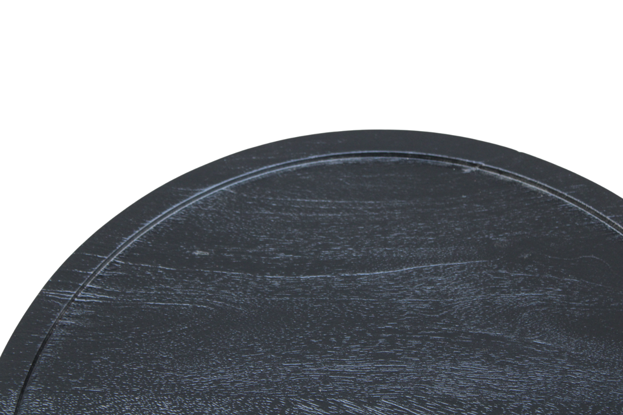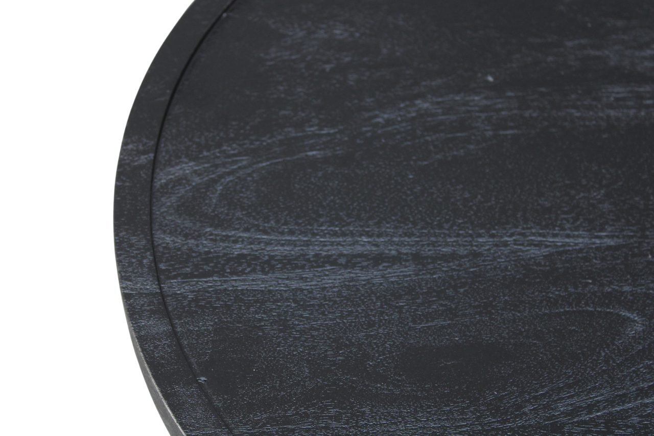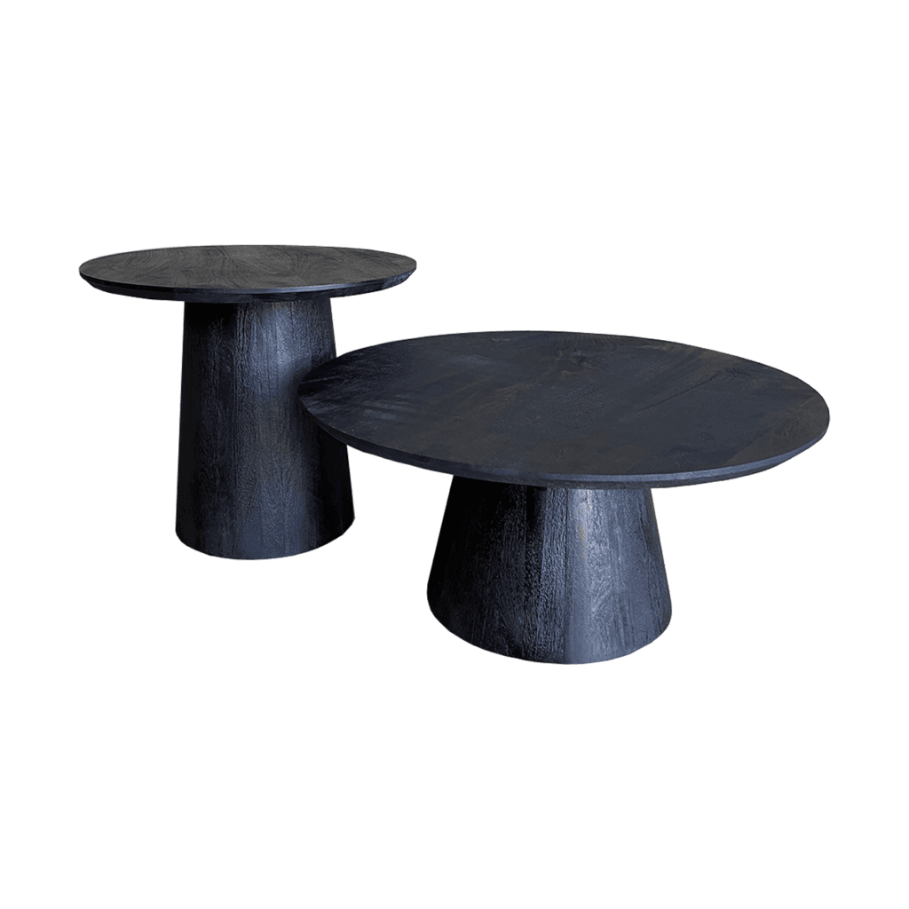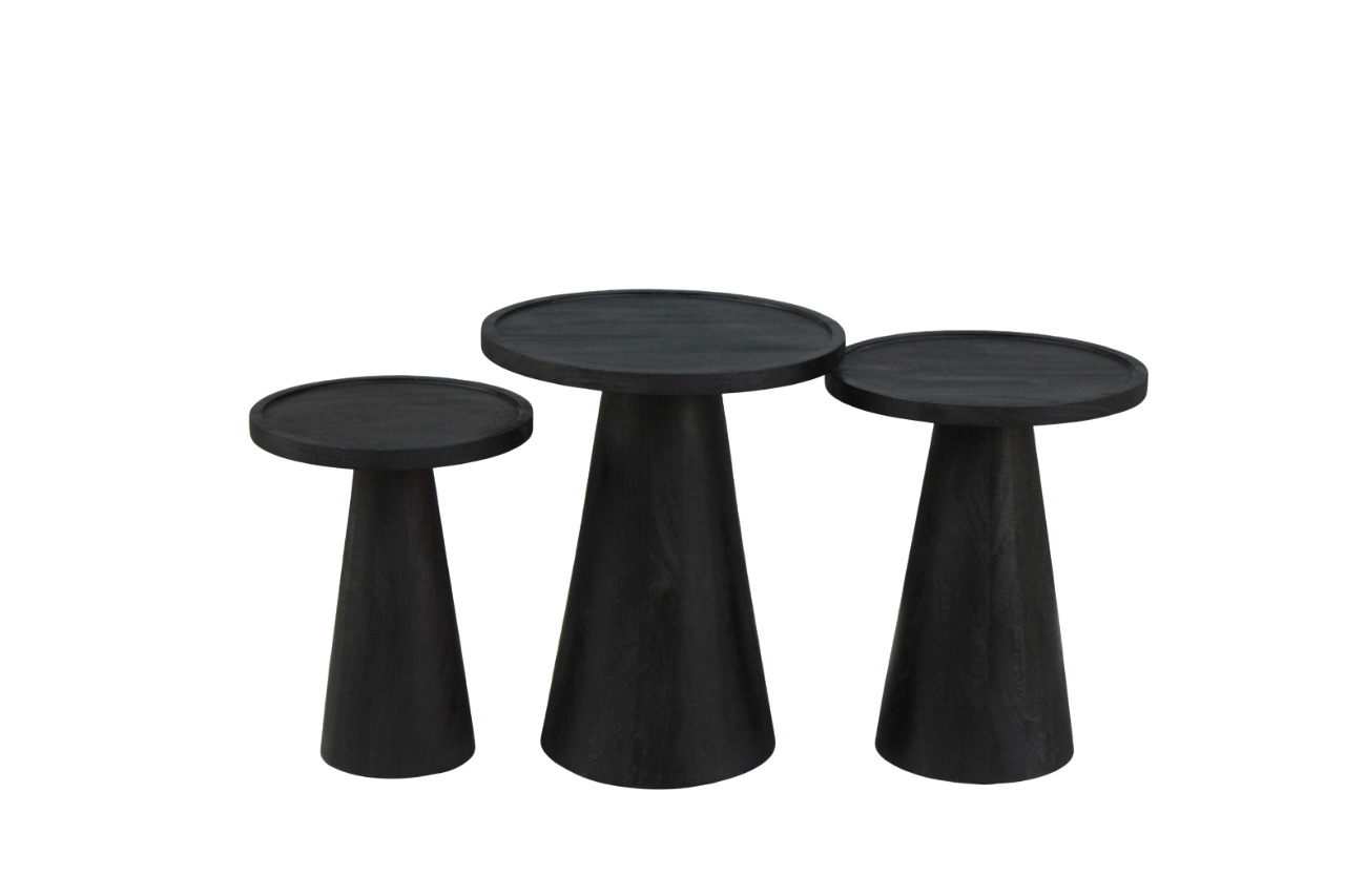 Set de 3 tables basses Oslo en bois de manguier noir. Design moderne avec des plateaux de table ronds et des pieds effilés. Élégant et polyvalent.