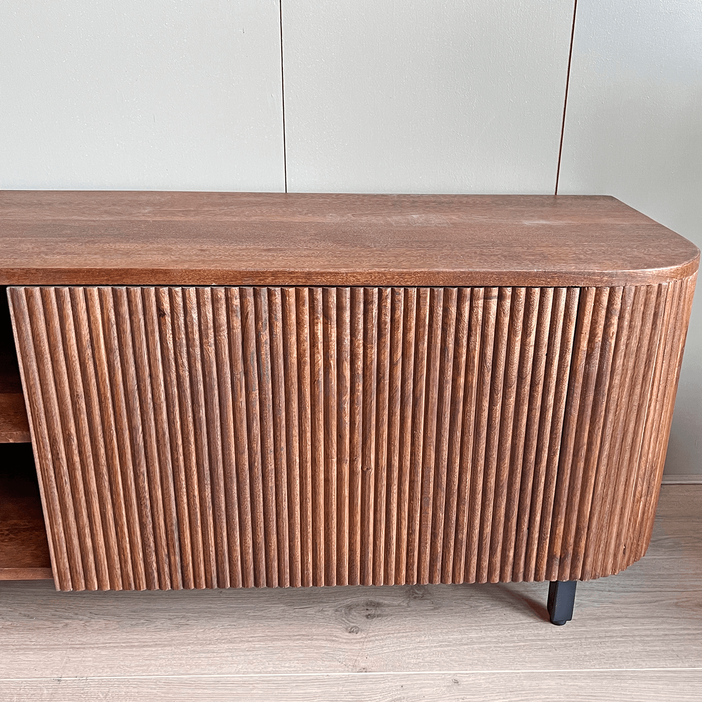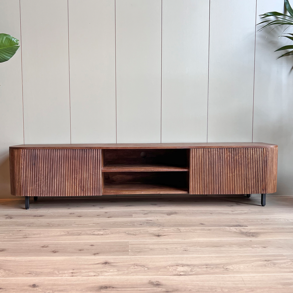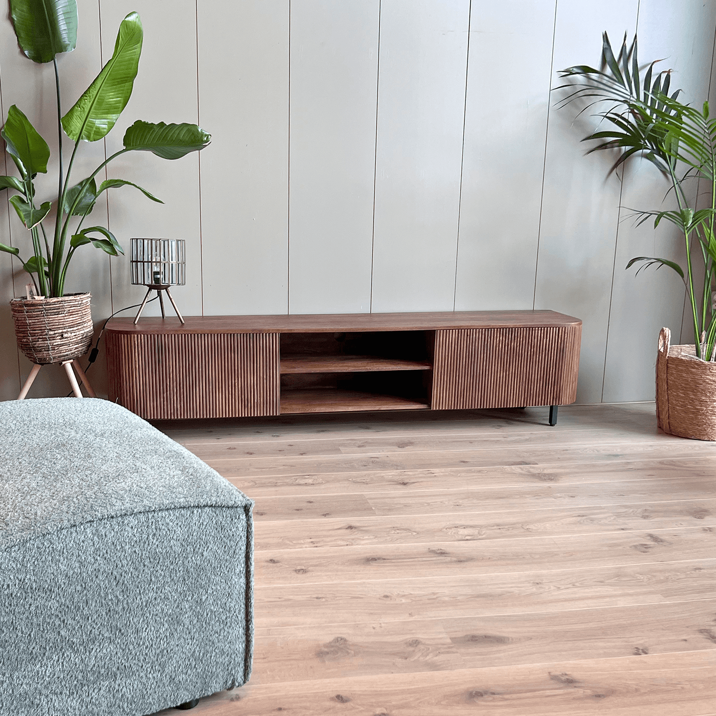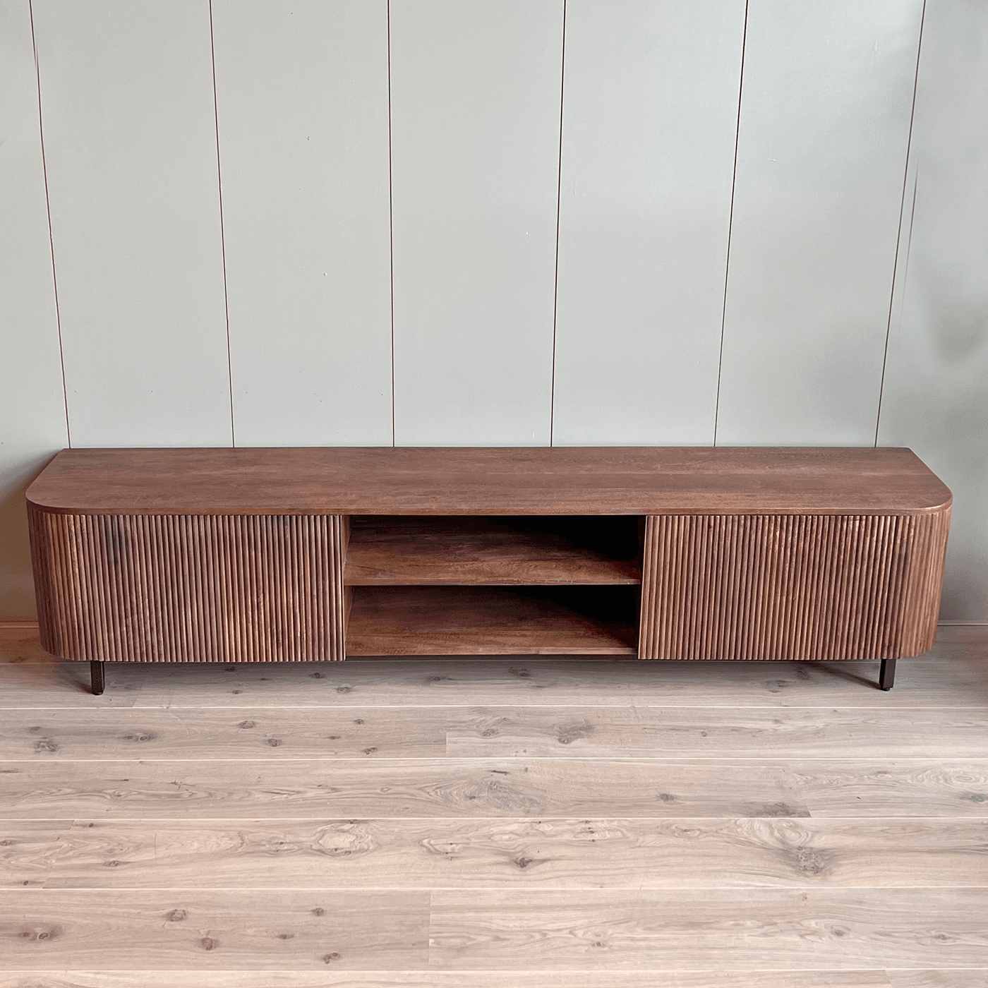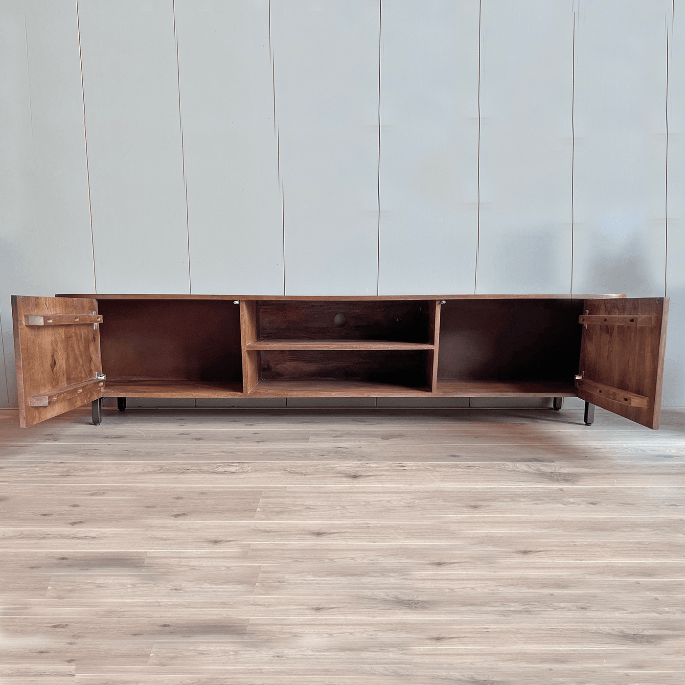 Verrijk je woonruimte met de Rome tv-kast, gemaakt van hoogwaardig mangohout. Stijlvol ontwerp en voldoende opbergruimte in een tijdloos meubelstuk.