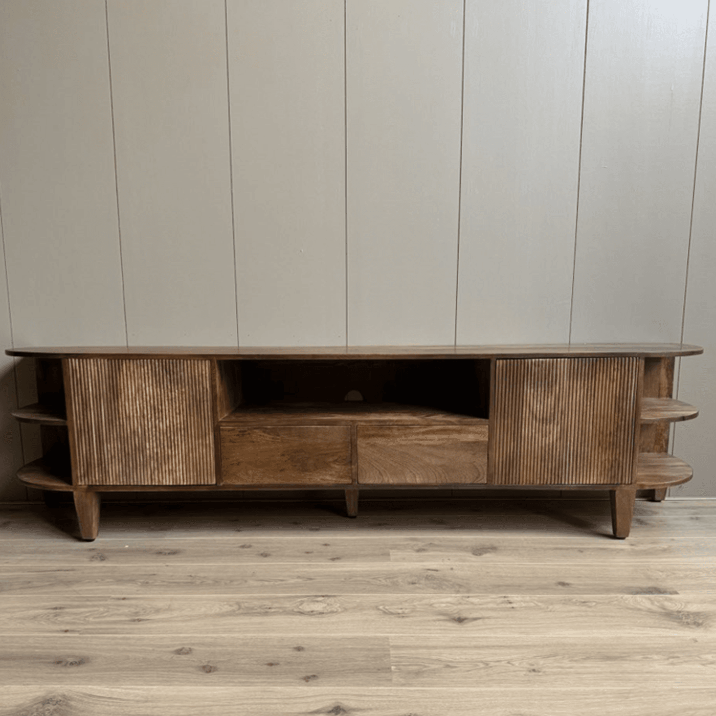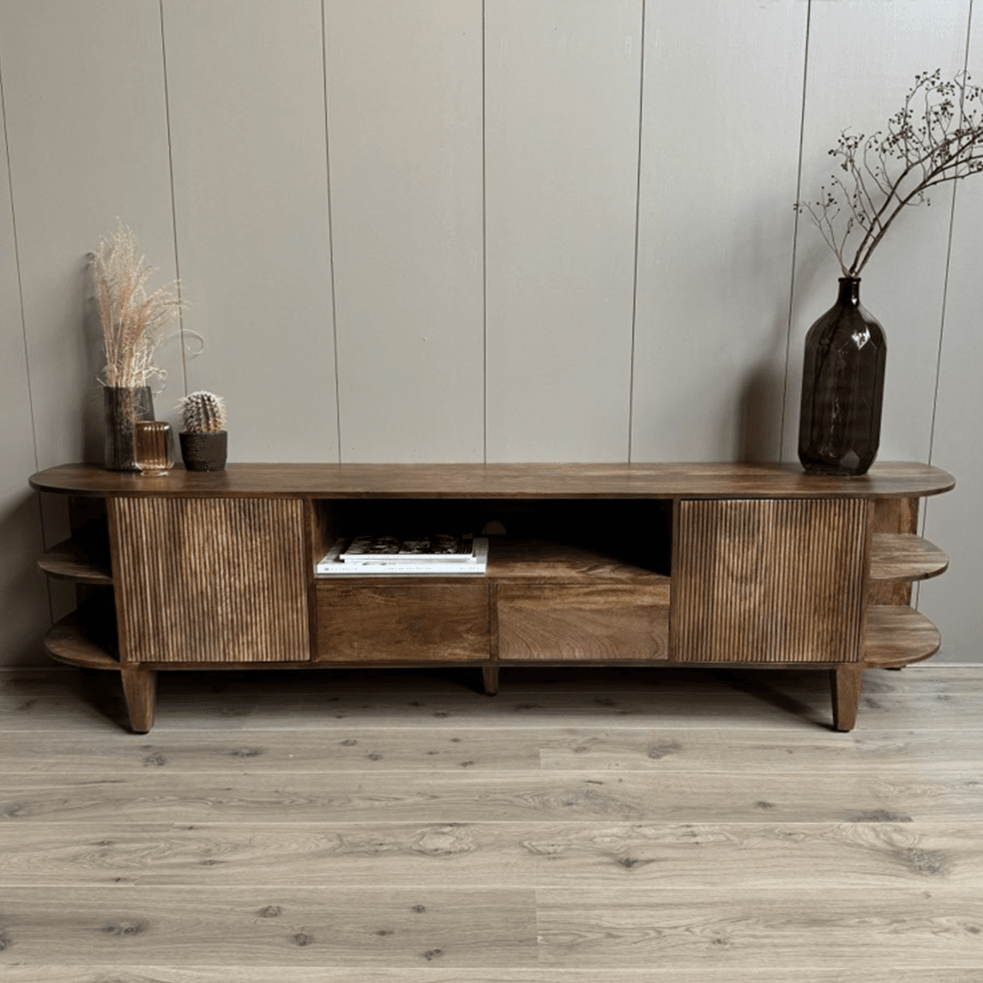 Bent u op zoek naar een TV-meubel met stijl? Kies dan voor ons televisiemeubel Reno. Deze kast is gemaakt van mangohout afgewerkt met een bruine walnoot kleur. Een praktisch en stijlvol opbergmeubel voor een echte eyecatcher in uw woonkamer. Verrijk u woonkamer met een uniek meubelstuk dat opvalt door zijn elegante ronde vormen. Met zijn organische vormgeving brengt het meubel een vleugje speelsheid en zachtheid in elke ruimte. Dit prachtige Hotel chique mangohouten Tv-meubel van Old Inn Wonen is een echte toevoeging aan je interieur!