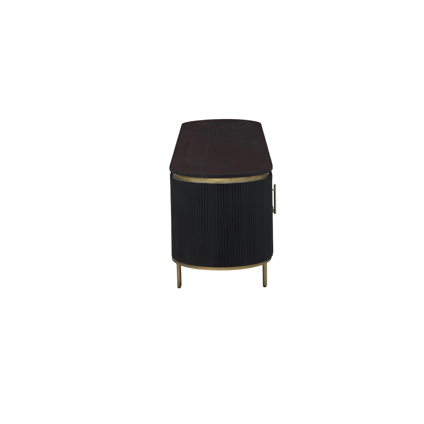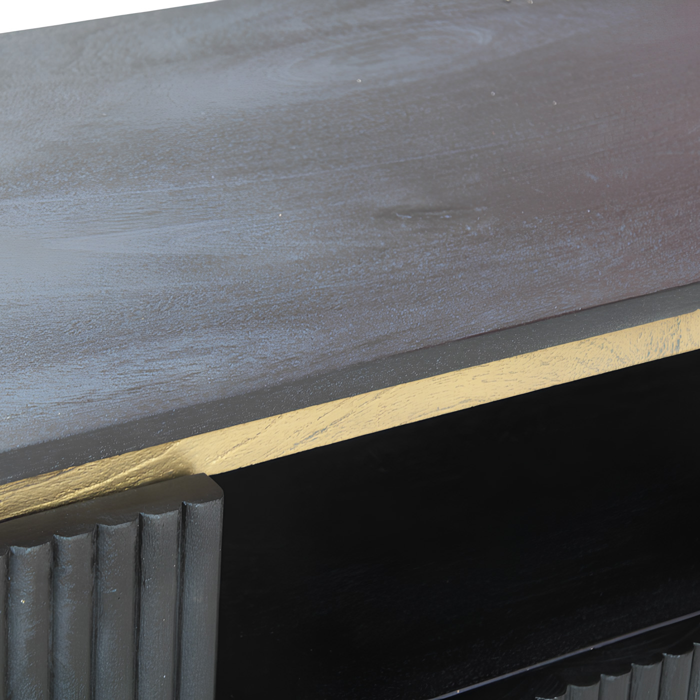 Tv-meubel Marrakesh 180cm van zwart mangohout met goudkleurige accenten. Modern design met open vak, lades en kasten. Elegant en functioneel.