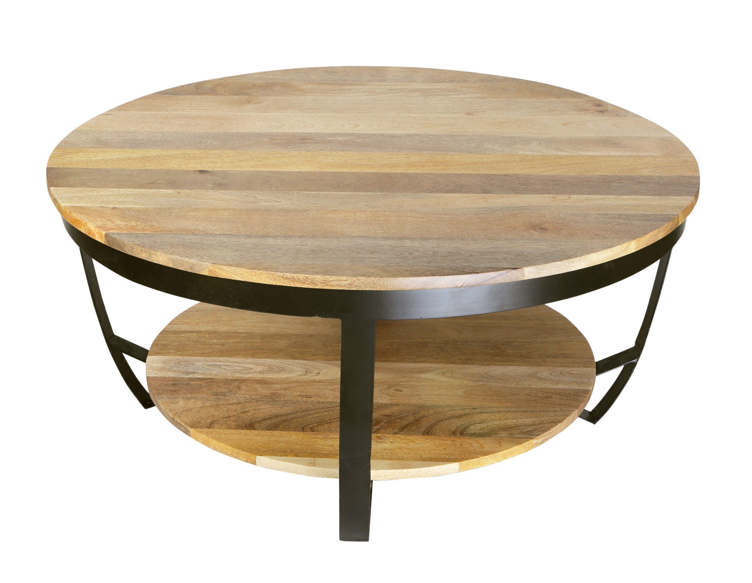 Ronde salontafel Paras van 90 cm met een mangohouten blad en een zwart metalen onderstel. Stoer, stijlvol en veelzijdig voor elk interieur.